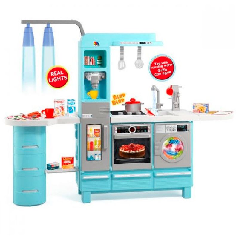 Cocina electrónica para los más pequeños de la casa. Es completa, dispone de nevera, horno, lavadora, cafetera, vitro-cerámica que reproduce sonidos y fregadero con agua corriente de verdad ¡Con luces reales! También dispone de diferentes compartimentos para que puedas almacenar tus utensilios de cocina o comida. Sus dimensiones son de 102 cm x 150 cm x 34 cm aproximadamente.